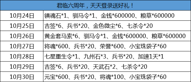 还有两天啦!大陆地区的六周年庆就要在10月24日开启!可能会有主公不太明白,8月份不是已经有过周年庆活动了么?没错,8月份是君临所有地区的周年活动,而10月24日则是大陆地区才有的周年纪念活动。