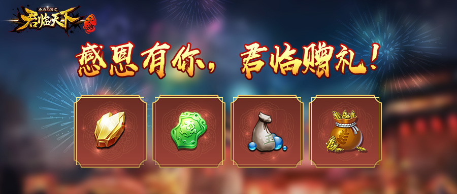 感谢主公长久以来的陪伴,在10月24日当天登录游戏,我们将通过邮件为主公再送上感恩礼包一个!只有10月24日当天登录才能领取哦,不要错过啦~