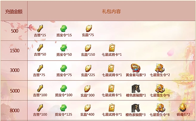 活动期间,单个角色累计充值达到指定金额,可获得对应丰厚奖励(档次奖励不累计,仅发放最高达成档次奖励)。