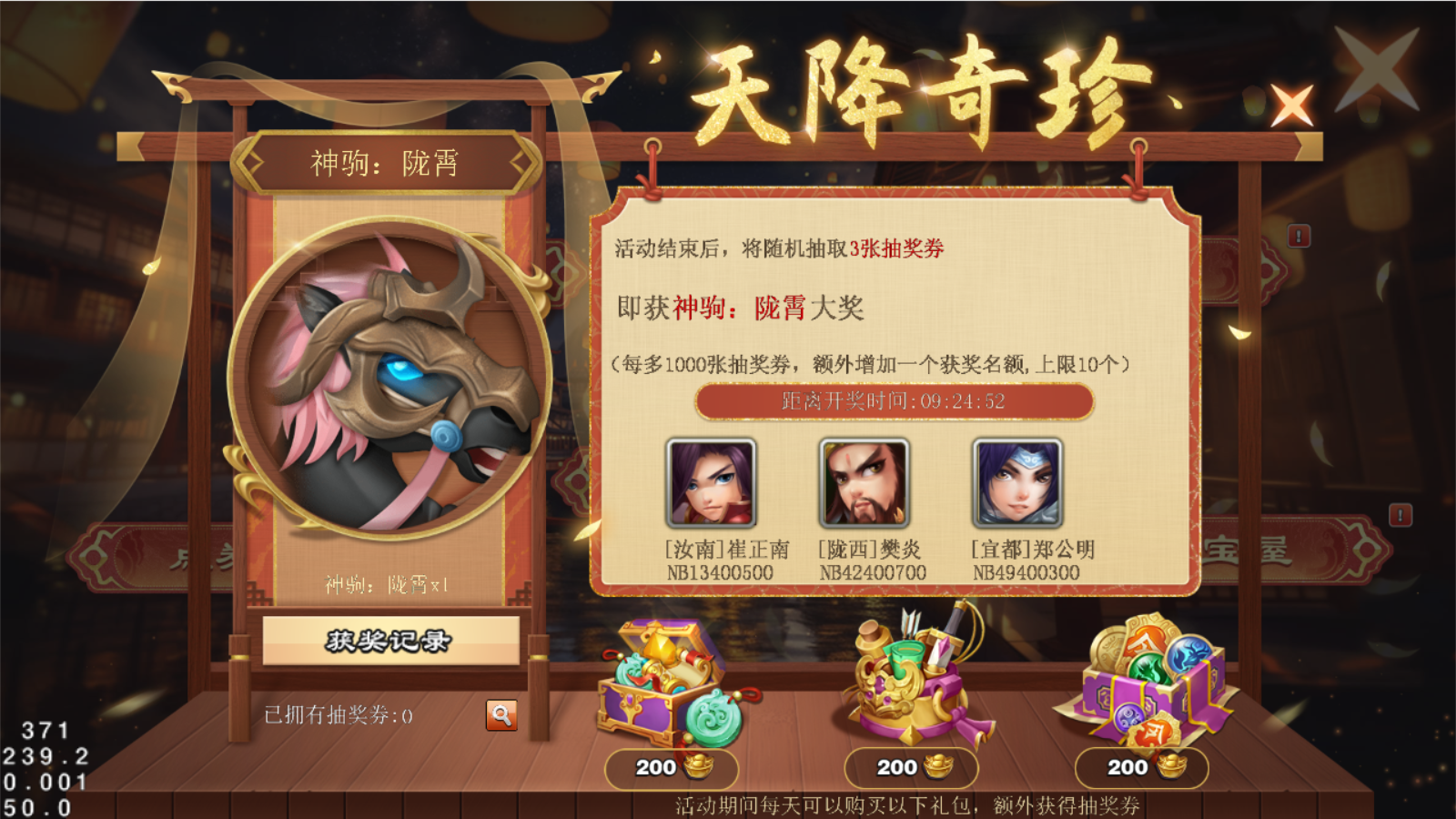 主公可以在此购买抽奖券礼包,除了获取随机道具还包含了一张抽奖券。会有不同的奇珍异宝加入奖池,祝每位主公好运满满!