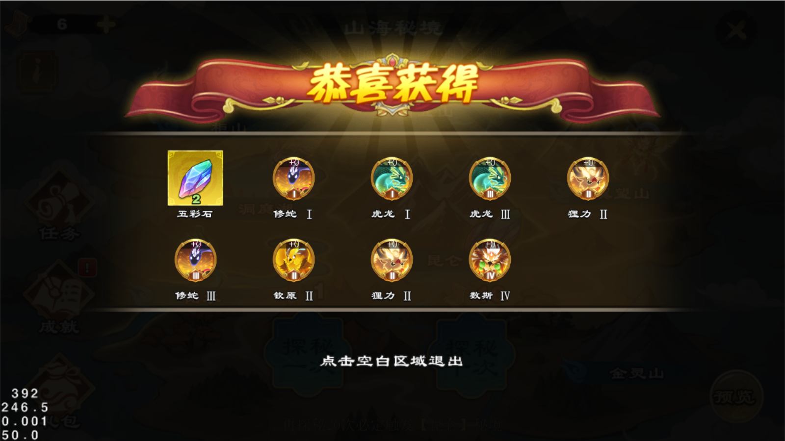 活动期间,可消耗秘宝图进行探秘,获得橙色秘境战魂或五彩石。