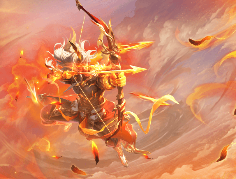 云气被焰光染作橘红,赤弓凝着熔岩般的炽焰,弓身盘着焰纹,拉满时似要撑裂苍穹。连落下来的残羽都沾了箭尖的焰,裹着烈阳的烫意。