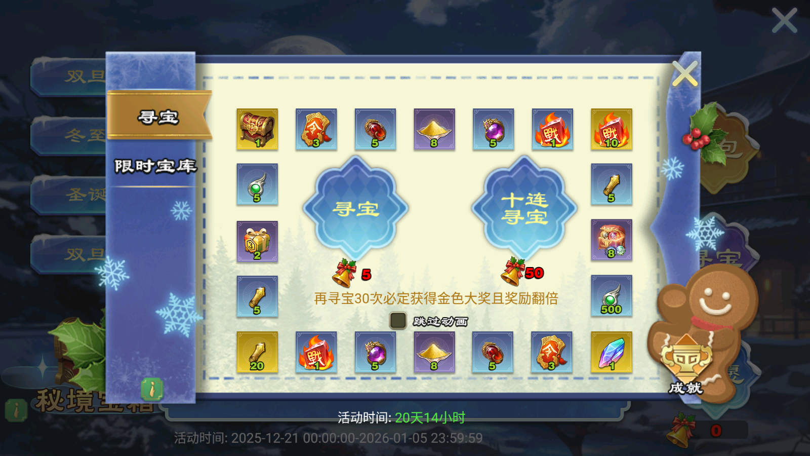 许愿值达到上限后,即可使用许愿铃进行寻宝,达到寻宝成就还可以领取额外奖励~