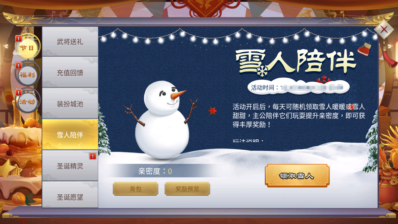 每天可以随机领取雪人暖暖或者雪人甜甜,主公陪伴雪人玩耍提升亲密度,即可获得丰厚奖励!