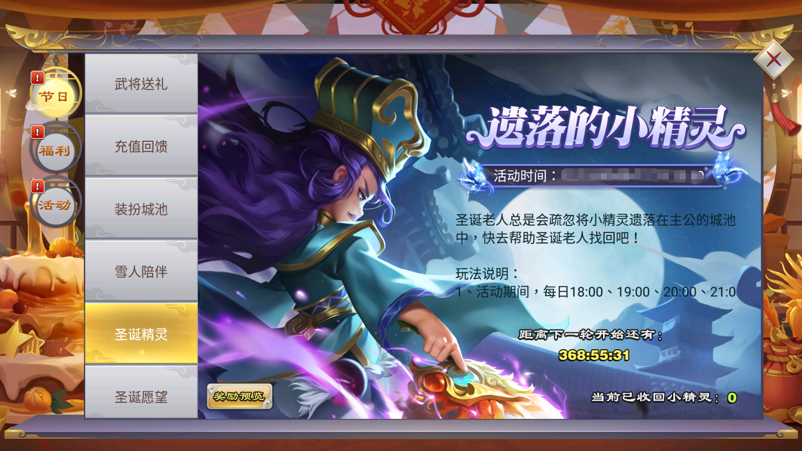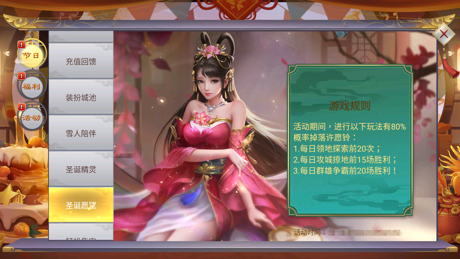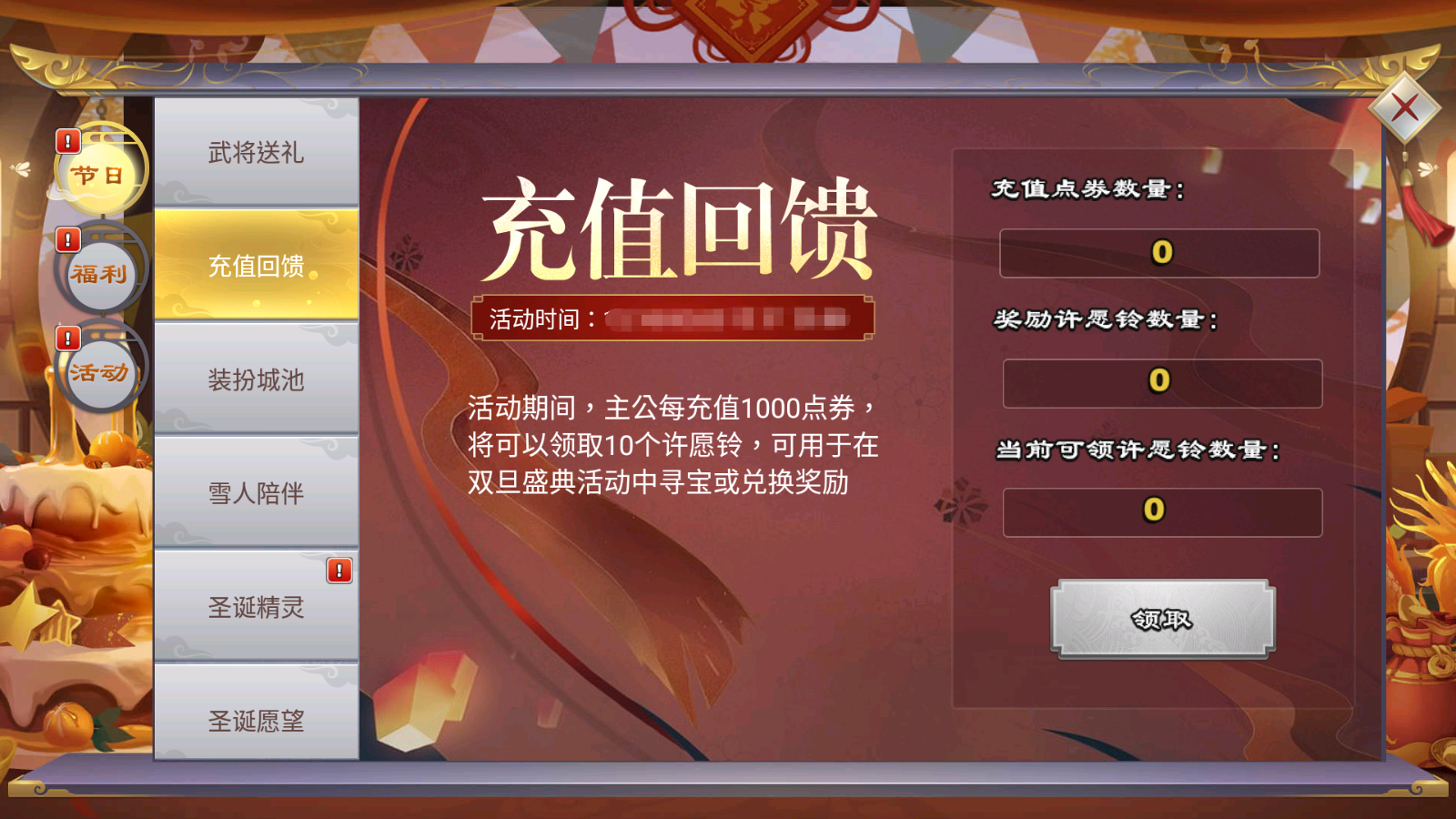 活动期间,主公每充值1000点券,都可以领取10个许愿铃。