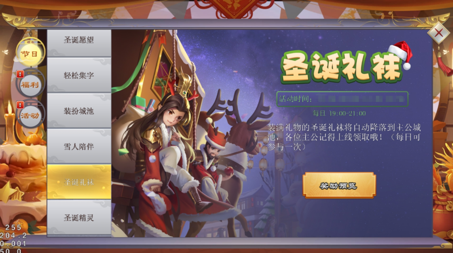 活动期间装满礼物的圣诞礼袜将自动降落到主公城池,大家记得准时上线领取噢~
