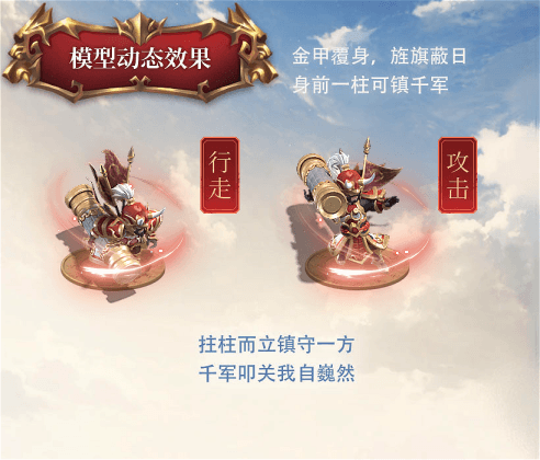 身披鎏金赤红战甲,纹饰盘绕着兽纹云纹,每一寸都透着历经百战的厚重质感。单掌拄定玄铁巨柱,柱身云纹盘绕,承万斤而不摧;身后旌旗在朔风中翻卷,与甲胄上的鎏金纹路交相辉映,每一处细节都在诉说这位名将 “镇守一方、威震九州” 的赫赫威名。