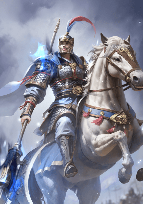 勒马而立,目光如炬。金盔上的翎羽,是刺破敌阵的锋芒,蓝焰自甲胄间腾起,红缨随马蹄轻扬,有千军破阵之威。再临阵前,凛凛英风如旧,只待战鼓再鸣,便要威震乾坤。