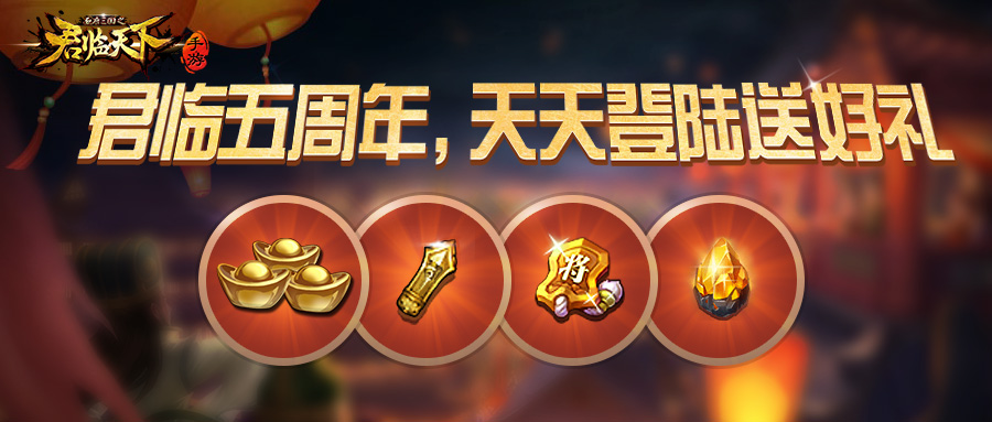 没错!大陆五周年庆活动期间,每日登录即可获得丰厚奖励!镇魂石、七星重生令、元宝、吉签、黄金套马索等各种大礼,就等主公前来参加啦!